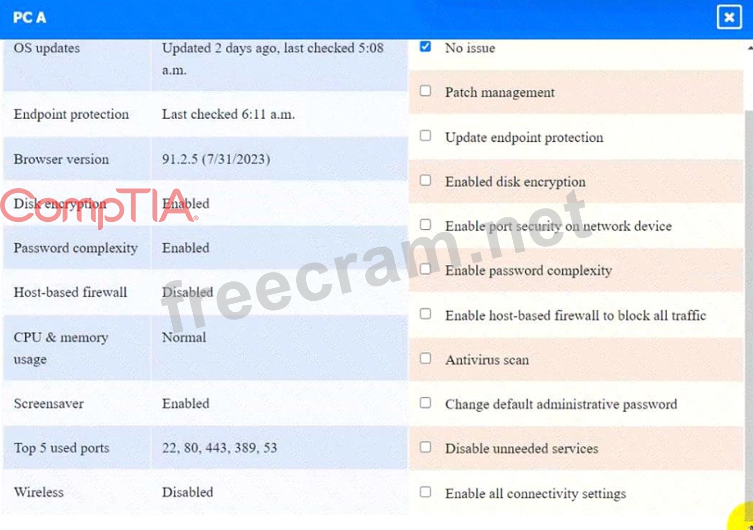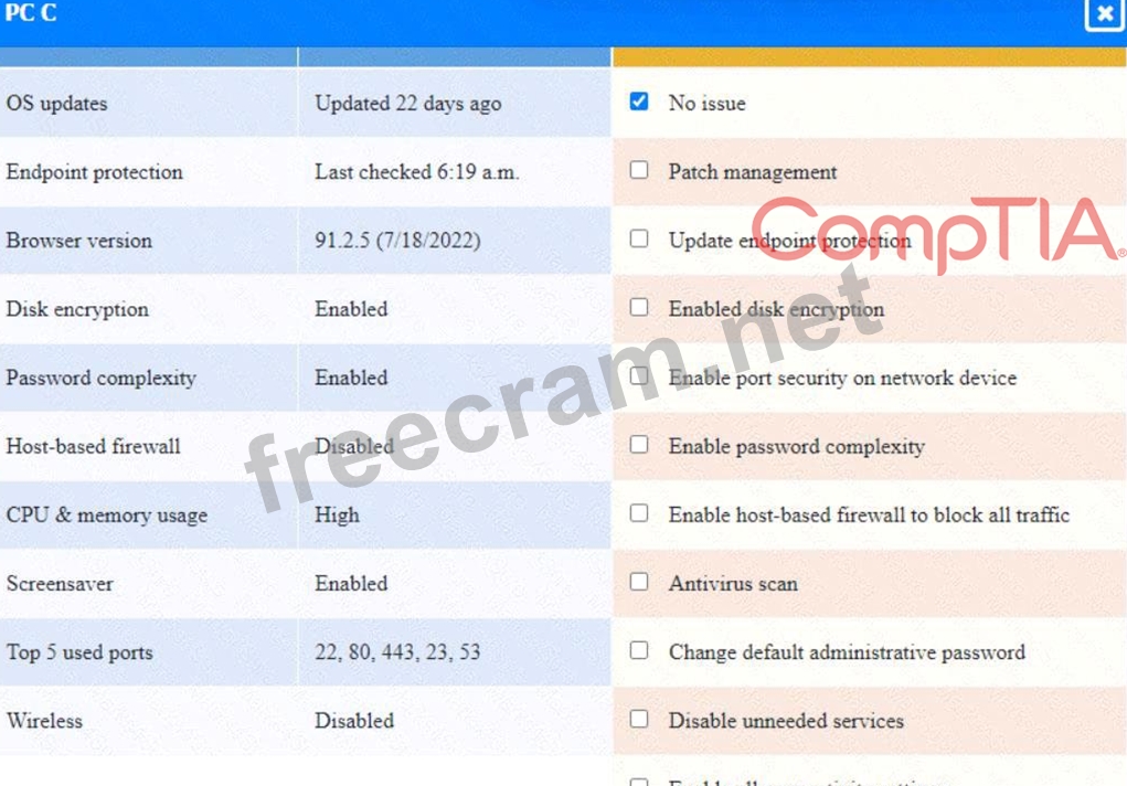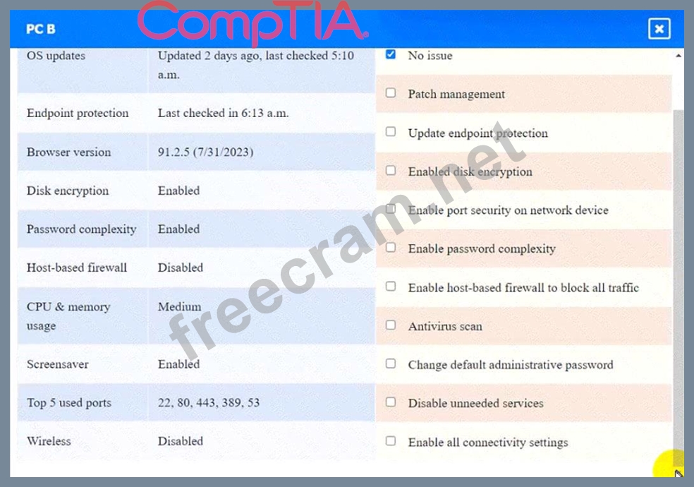 This option will turn off the host-based firewall and allow all traffic to pass through. This will comply with the requirement and also improve the connectivity of PC A to other devices on the network. However, this option will also reduce the security of PC A and make it more vulnerable to attacks. Therefore, it is recommended to use other security measures, such as antivirus, encryption, and password complexity, to protect PC A from potential threats.