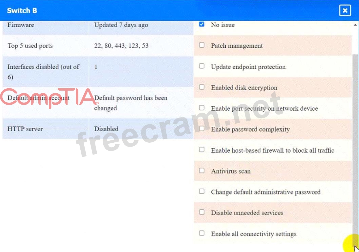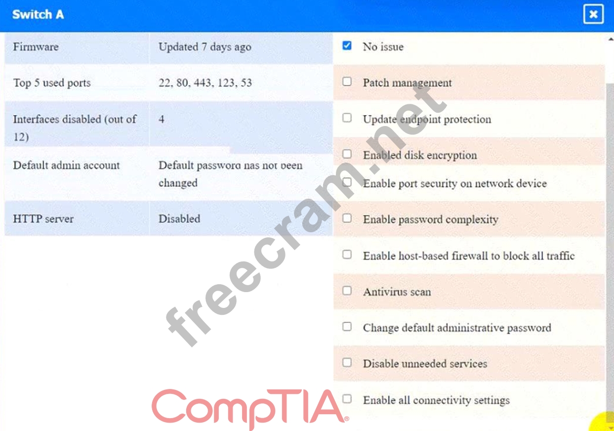 Switch A: No issue found. The Switch A is configured correctly and meets the requirements.