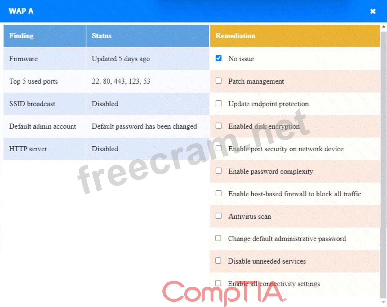 WAP A: No issue found. The WAP A is configured correctly and meets the requirements.