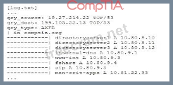 The log snippet indicates a DNS AXFR (zone transfer) request, which can be exploited by attackers to gather detailed information about an internal network's infrastructure. Disabling DNS zone transfers is the best solution to mitigate this risk. Zone transfers should generally be restricted to authorized secondary DNS servers and not be publicly accessible, as they can reveal sensitive network information that facilitates lateral movement during an attack. References: CompTIA SecurityX Study Guide: Discusses the importance of securing DNS configurations, including restricting zone transfers. NIST Special Publication 800-81, "Secure Domain Name System (DNS) Deployment Guide": Recommends restricting or disabling DNS zone transfers to prevent information leakage.