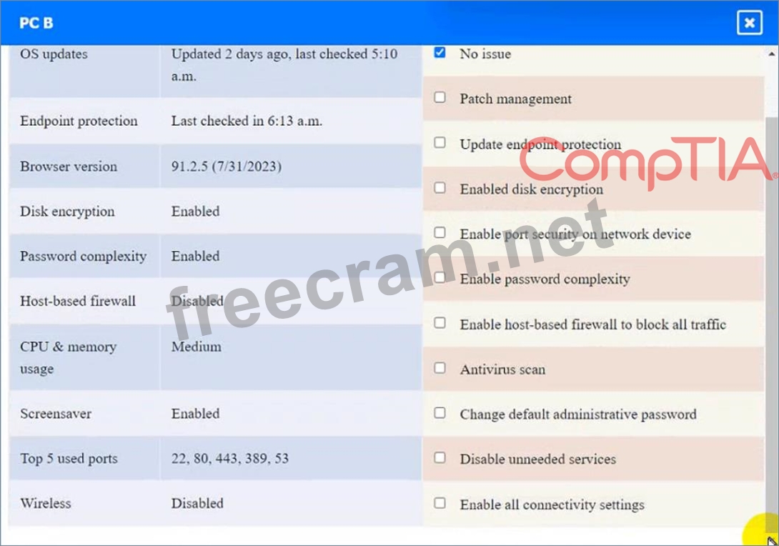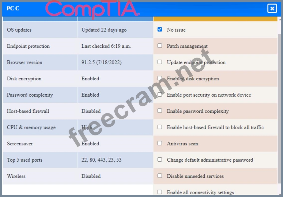 This option will turn off the host-based firewall and allow all traffic to pass through. This will comply with the requirement and also improve the connectivity of PC A to other devices on the network. However, this option will also reduce the security of PC A and make it more vulnerable to attacks. Therefore, it is recommended to use other security measures, such as antivirus, encryption, and password complexity, to protect PC A from potential threats.