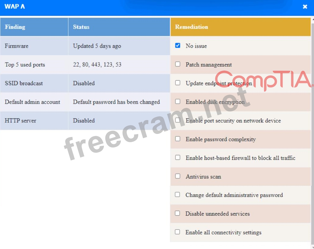 WAP A: No issue found. The WAP A is configured correctly and meets the requirements.