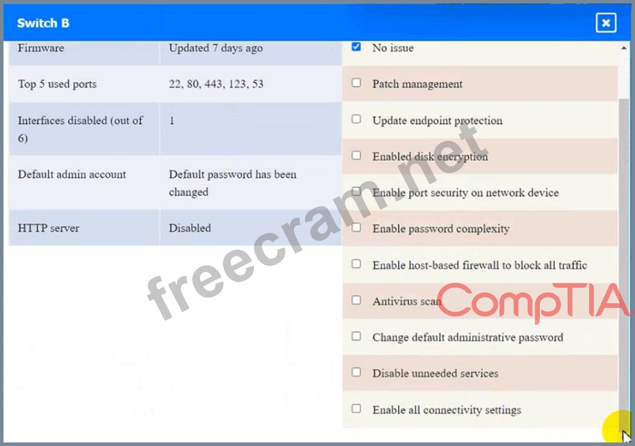 Switch B: No issue found. The Switch B is configured correctly and meets the requirements.