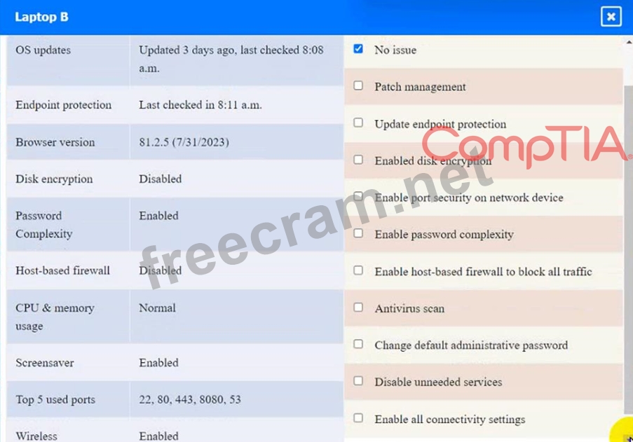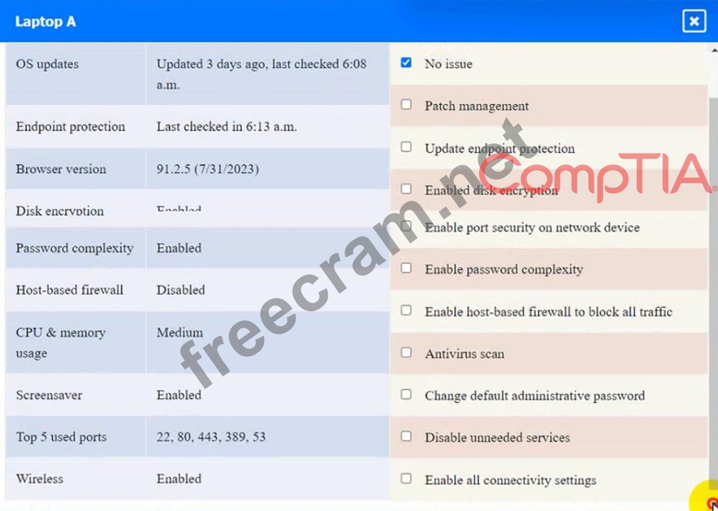 This option will install the updates that are available for Laptop A and ensure that it has the most recent security patches and bug fixes. This will comply with the requirement and also improve the performance and stability of Laptop A. However, this option may also require a reboot of Laptop A and some downtime during the update process. Therefore, it is recommended to backup any important data and close any open applications before applying the updates.