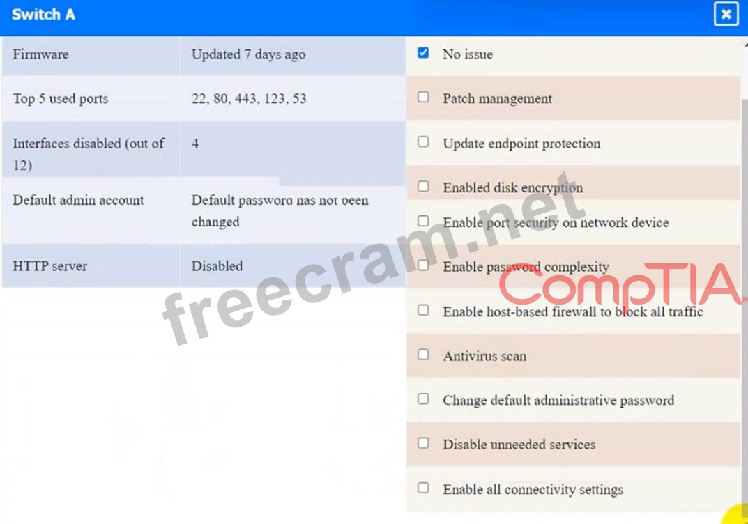 Switch A: No issue found. The Switch A is configured correctly and meets the requirements.