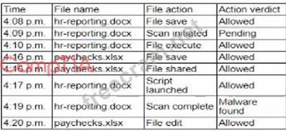 The event timeline indicates a sequence where a file (hr-reporting.docx) was saved, scanned, executed, and eventually found to contain malware. The critical issue here is that the malware scan completed after the file was already executed. This suggests a Time-Of-Check to Time-Of-Use (TOCTOU) vulnerability, where the state of the file changed between the time it was checked and the time it was used. Reference: CompTIA SecurityX Study Guide: Discusses TOCTOU vulnerabilities as a timing attack where the state of a resource changes after it has been validated. NIST Special Publication 800-53, "Security and Privacy Controls for Federal Information Systems and Organizations": Recommends addressing TOCTOU vulnerabilities to ensure the integrity of security operations. "The Art of Software Security Assessment" by Mark Dowd, John McDonald, and Justin Schuh: Covers logic flaws and timing vulnerabilities, including TOCTOU issues.