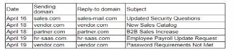 In reviewing email headers and determining actions to mitigate phishing attempts, the security analyst should focus on patterns of suspicious behavior and the reputation of the sending domains. Here's the analysis of the options provided: A: Block messages from hr-saas.com because it is not a recognized domain: Blocking a domain solely because it is not recognized can lead to legitimate emails being missed. Recognition alone should not be the criterion for blocking. B: Reroute all messages with unusual security warning notices to the IT administrator: While rerouting suspicious messages can be a good practice, it is not specific to the domain sending repeated suspicious messages. C: Quarantine all messages with sales-mail.com in the email header: Quarantining messages based on the presence of a specific domain in the email header can be too broad and may capture legitimate emails. D: Block vendor com for repeated attempts to send suspicious messages: This option is the most appropriate because it targets a domain that has shown a pattern of sending suspicious messages.Blocking a domain that repeatedly sends phishing attempts without previous communications helps in preventing future attempts from the same source and aligns with the goal of mitigating phishing risks.