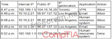 Based on the provided logs, the user has accessed various applications from different geographic locations within a very short timeframe. This pattern is indicative of the "impossible travel"security rule, a common feature in Single Sign-On (SSO) systems designed to detect and prevent fraudulent access attempts. Analysis of Logs: At 8:47 p.m., the user accessed a VPN from Toronto. At 8:48 p.m., the user accessed email from Los Angeles. At 8:48 p.m., the user accessed the human resources system from Los Angeles. At 8:49 p.m., the user accessed email again from Los Angeles. At 8:52 p.m., the user attempted to access the human resources system from Toronto, which was denied. These rapid changes in location are physically impossible and typically trigger security measures to prevent unauthorized access. The SSO system detected these inconsistencies and likely flagged the activity as suspicious, resulting in access denial.