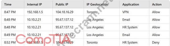 The logs show that the user connected fromToronto (104.18.16.29)andLos Angeles (95.67.137.12)within minutes. The sudden location change is a typical trigger forgeoblocking in a Next-Generation Firewall (NGFW), leading to theHR System being denied. * A compromised account (B)would show failed login attempts or unusual activities, but all other access attempts were allowed. * Business hours restriction (C)is unlikely since the user was granted access earlier. * Approved subnet issues (D)would affect all applications, not just HR System access.
