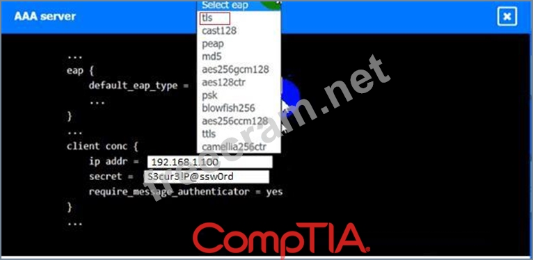 An IPSec solution is being deployed. The configuration files for both the VPN concentrator and the AAA server are shown in the diagram.
