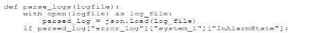 The code function provided in the question seems tobe designed to parse JSON formatted logs to check for an alarm state. Option A is a JSON format that matches the structure likely expected by the code. The presence of the "error_log" and "InAlarmState" keys suggests that this is the correct input format. Reference: CompTIA SecurityX Study Guide, Chapter on Log Management and Automation, Section on Parsing Structured Logs.
