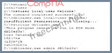 The output indicates that the software tool contains hard-coded credentials, which attackers can exploit to bypass user access controls and load the database. The mostlikely recommendation is to remove hard-coded credentials from the source code. Here's why: Security Best Practices: Hard-coded credentials are a significant security risk because they can be easily discovered through reverse engineering or simple inspection of the code. Removing them reduces the risk of unauthorized access. Credential Management: Credentials should be managed securely using environment variables, secure vaults, or configuration management tools that provide encryption and access controls. Mitigation of Exploits: By eliminating hard-coded credentials, the organization can prevent attackers from easily bypassing authentication mechanisms and gaining unauthorized access to sensitive systems. References: CompTIA Security+ SY0-601 Study Guide by Mike Chapple and David Seidl OWASP Top Ten: Insecure Design NIST Special Publication 800-53: Security and Privacy Controls for Information Systems and Organizations