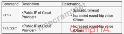 The most likely reason for the latency is service degradation on the ISP. The results show that the ping and traceroute commands have sporadic timeout and increased round-trip values when reaching the public IP address of the cloud provider. This indicates that there is a network issue between the organization and the cloud provider, which could be caused by service degradation on the ISP. Service degradation on the ISP means that the ISP is experiencing reduced performance or availability of its network services, which can affect the quality and speed of the data transmission. Service degradation on the ISP can be caused by various factors, such as congestion, routing problems, hardware failures, or maintenance activities. To resolve this issue, the systems administrator should contact the ISP and report the problem, and request a status update or a resolution plan. Reference: CompTIA Cloud+ CV0-003 Certification Study Guide, Chapter 3, Objective 3.2: Given a scenario, troubleshoot network connectivity issues.