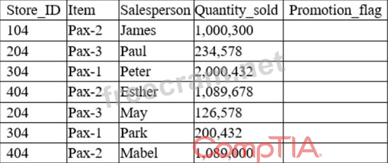 A data analyst has been asked to derive a new variable labeled "Promotion_flag" based on the total quantity sold by each salesperson. Given the table below: