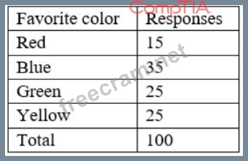 A pie chart is the best choice to show the composition between the categories of the survey response data set. A pie chart represents the whole with a circle, divided by slices into parts. Each slice shows the relative size of each category as a percentage of the total. A pie chart is useful when the categories are mutually exclusive and add up to 100%. The table shows the favorite color and the number of responses for each color, which can be easily converted into percentages. A pie chart can show how each color contributes to the total number of responses. Option A is incorrect because a histogram is used to show how data points are distributed along a numerical scale. The survey response data set is not numerical, but categorical. Option C is incorrect because a line chart is used to show trends or changes over time. The survey response data set does not have a time dimension. Option D is incorrect because a scatter plot is used to show the relationship between two numerical variables. The survey response data set does not have two numerical variables. Option E is incorrect because a waterfall chart is used to show how an initial value is increased or decreased by a series of intermediate values. The survey response data set does not have an initial value or intermediate values. Reference: How to Choose the Right Chart for Your Data - Infogram How to Choose the Right Data Visualization | Tutorial by Chartio Find the Best Visualizations for Your Metrics - The Data School How to choose the best chart or graph for your data
