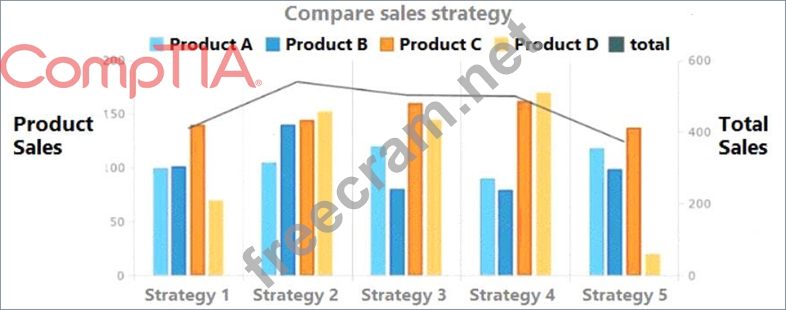Strategy 4 provides the best sales in comparison to other strategies. This is because the total sales for Strategy 4 are the highest among all the strategies, as shown by the black line. The other statements are not accurate or do not uphold integrity in data reporting. Here is why: Statement A is false because sales are not approximately equal for Product A and Product B across all strategies. For example, in Strategy 1, Product A has more sales than Product B, while in Strategy 3, Product B has more sales than Product A. Statement C is misleading because it does not account for the difference in scale between the products. While Strategy 2 has the highest total sales among all products, it does not necessarily mean that it is the most effective for each product. For instance, Product D has very low sales in Strategy 2 compared to other strategies. Statement D is biased because it does not provide any evidence or justification for why Product D should be promoted more than the other products in all strategies. It also ignores the fact that Product D has the lowest sales among all products in most of the strategies.
