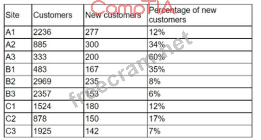 The best type of chart to display the data is A. Include a bar chart using the site and the percentage of new customers data. A bar chart is a good choice for comparing categorical data with numerical data, such as the site and the percentage of new customers. A bar chart can show the relative differences between the sites and highlight the site with the highest percentage of new customers. A bar chart can also be easily labeled and formatted to make the data clear and understandable. A line chart is not suitable for this data, because it is used to show trends or changes over time, which is not relevant for the site and the percentage of new customers data. A line chart would also be confusing and misleading, as it would imply a connection or correlation between the sites that does not exist. A pie chart is also not a good choice for this data, because it is used to show the proportion of a whole, not the comparison of different categories. A pie chart would also be difficult to read and interpret, as it would require labels or legends to identify the sites and their percentages. A pie chart would also not be able to show the exact values of the percentages, only their relative sizes. A scatter chart is another inappropriate option for this data, because it is used to show the relationship or correlation between two numerical variables, not between a categorical and a numerical variable. A scatter chart would also be cluttered and unclear, as it would plot each site as a point on a coordinate plane, without any labels or axes. A scatter chart would also not be able to show the differences or rankings between the sites and their percentages.