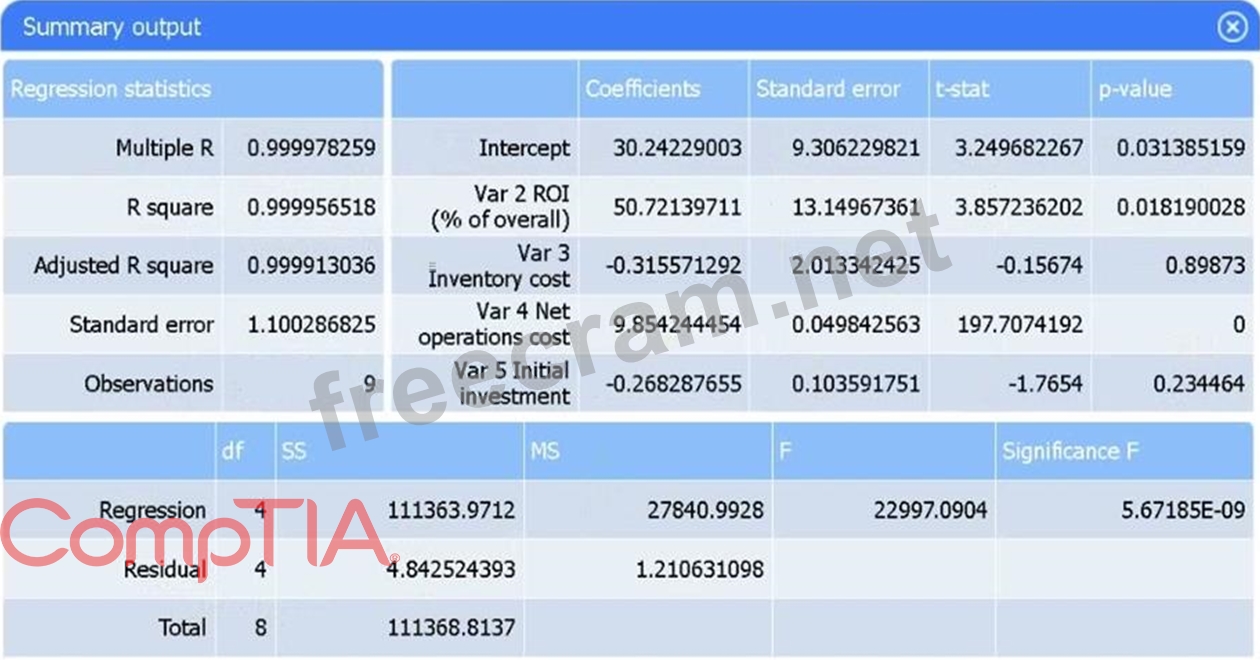 Net operations cost has a p-value of essentially 0 (far below 0.05), indicating it is the only additional predictor statistically significant in explaining sales. Neither inventory cost (p#0.90) nor initial investment (p#0.23) reach significance.