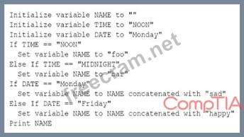 The pseudocode given in the question is a program that assigns different values to the variable NAME based on the values of the variables TIME and DATE. The program starts by initializing the variables NAME, TIME, and DATE with empty strings, "NOON", and "Monday" respectively. Then, it uses two nested IF-ELSE statements to check the values of TIME and DATE and modify the value of NAME accordingly. The first IF-ELSE statement checks if TIME is equal to "NOON". If it is, it sets NAME to "foo". If it is not, it checks if TIME is equal to "MIDNIGHT". If it is, it sets NAME to "bar". If it is not, it does nothing. The second IF-ELSE statement checks if DATE is equal to "Monday". If it is, it concatenates "sad" to the end of NAME. If it is not, it checks if DATE is equal to "Friday". If it is, it concatenates "happy" to the end of NAME. If it is not, it does nothing. Finally, the program prints the value of NAME. Since the values of TIME and DATE are "NOON" and "Monday" respectively, the program will set NAME to "foo" in the first IF-ELSE statement and then add "sad" to it in the second IF-ELSE statement. Therefore, the output of the program will be "foosad". References: CompTIA IT Fundamentals (ITF+) Certification Guide, pages