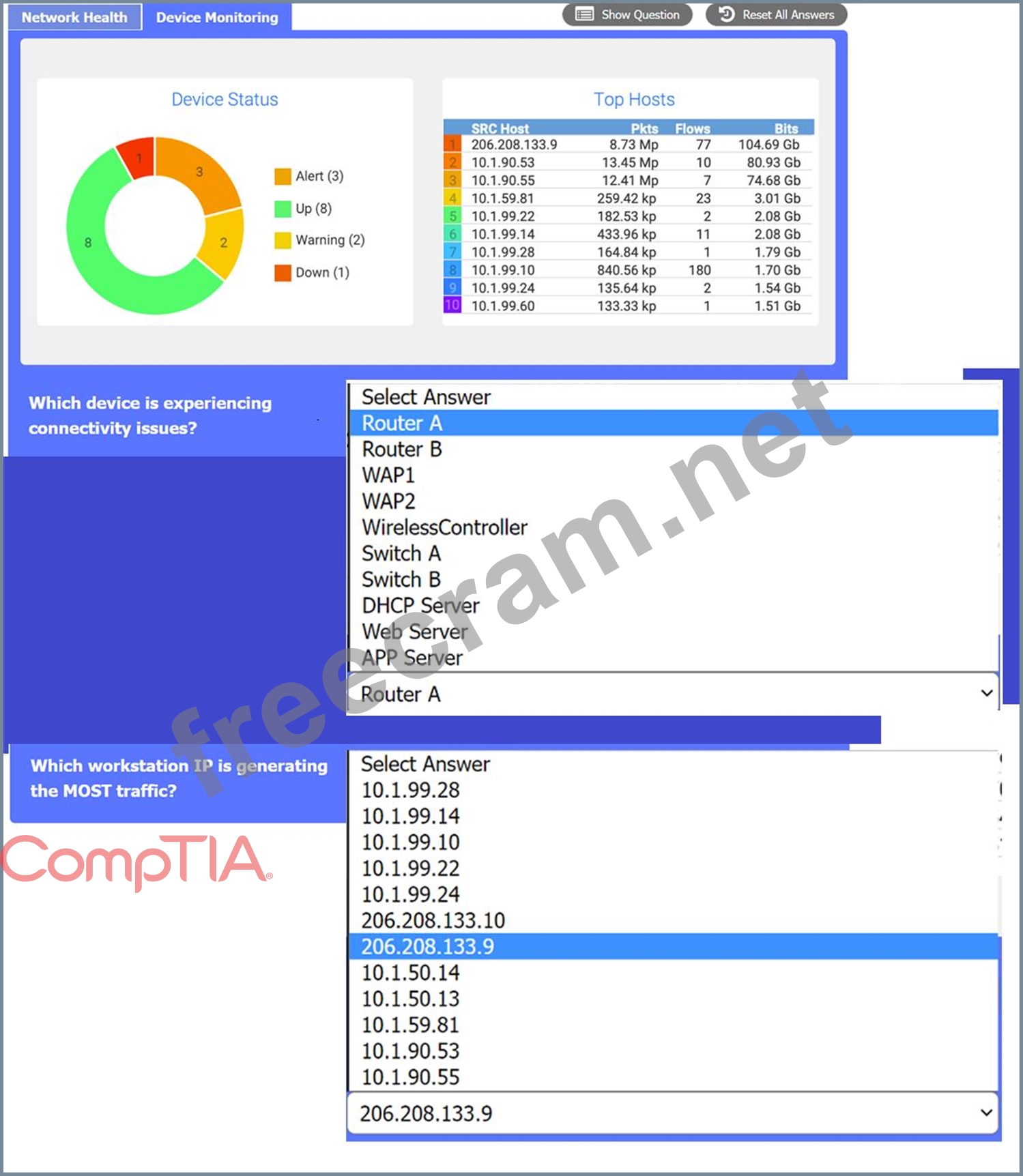 the device that is experiencing connectivity issues is the APP Server or Router 1, which has a status of Down. This means that the server is not responding to network requests or sending any dat a. You may want to check the physical connection, power supply, and configuration of the APP Server to troubleshoot the problem.