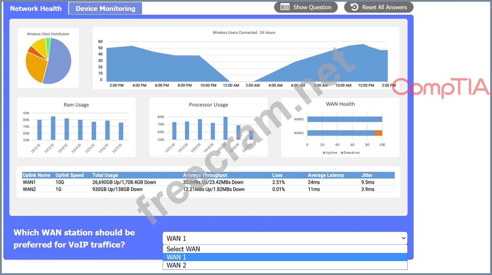 WAN 2 appears to have a lower average latency and loss percentage, which would make it the preferred WAN station for VoIP traffic. VoIP traffic requires low latency and packet loss to ensure good voice quality and reliability. WAN 1 seems to have higher RAM and processor usage, which could also affect the performance of VoIP traffic.