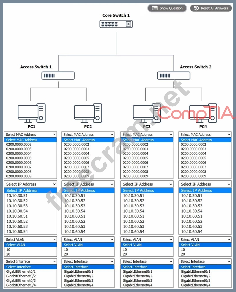 The VLAN configuration of Core Switch 1 is VLAN 1: 192.168.1.0/24, VLAN 2: 192.168.2.0/24, VLAN 3: 192.168.3.0/24.