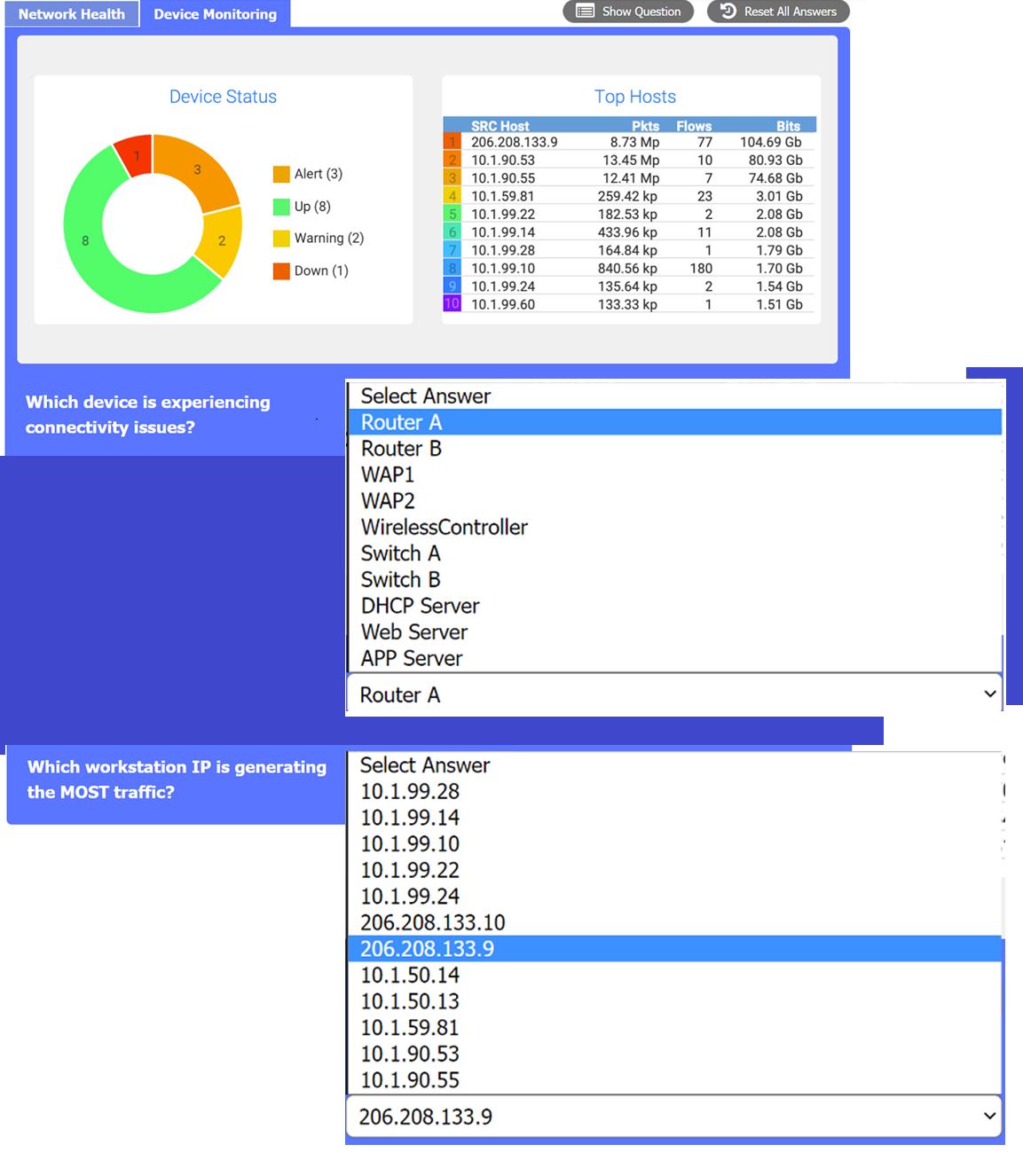 the device that is experiencing connectivity issues is the APP Server or Router 1, which has a status of Down. This means that the server is not responding to network requests or sending any dat a. You may want to check the physical connection, power supply, and configuration of the APP Server to troubleshoot the problem.