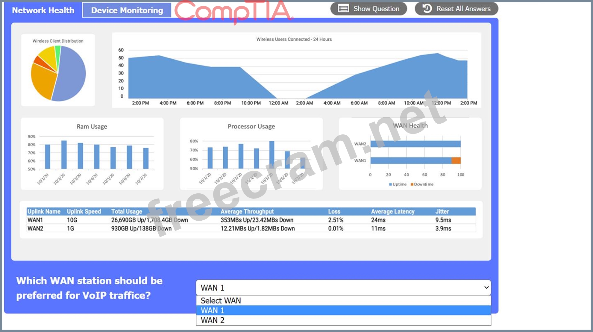 WAN 2 appears to have a lower average latency and loss percentage, which would make it the preferred WAN station for VoIP traffic. VoIP traffic requires low latency and packet loss to ensure good voice quality and reliability. WAN 1 seems to have higher RAM and processor usage, which could also affect the performance of VoIP traffic.