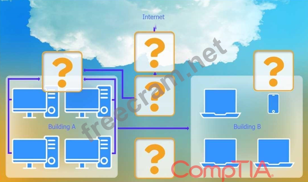 Bottom-left (Building A): Firewall (inspect traffic before it enters the network) Top-middle (Internet connection): Router Bottom-middle (between buildings): Wireless Range Extender Top-right (Building B): Wireless Access Point (WAP) In this corrected setup, the WAP in Building B will connect wirelessly to the Wireless Range Extender, which is connected to the Router. The Router is connected to the Firewall to ensure all traffic is inspected before it enters the network.