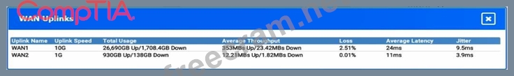 Given this information, WAN 2 would generally be preferred for VoIP traffic due to its lower latency, lower jitter, and significantly lower loss percentage, despite its lower bandwidth compared to WAN 1. The high bandwidth of WAN 1 may be more suitable for other types of traffic that are less sensitive to latency and jitter, such as bulk data transfers.