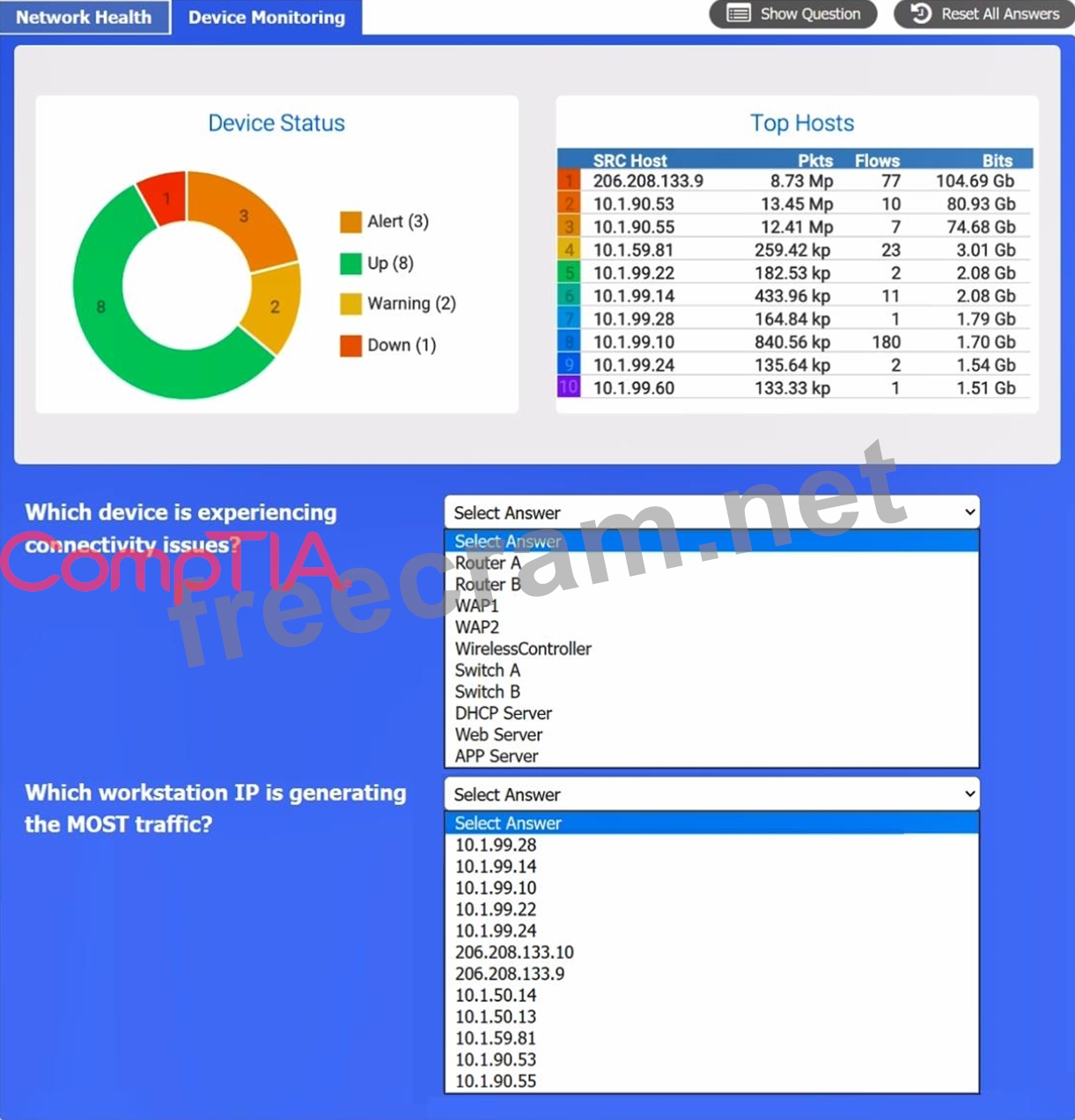 the device that is experiencing connectivity issues is the APP Server or Router 1, which has a status of Down. This means that the server is not responding to network requests or sending any data. You may want to check the physical connection, power supply, and configuration of the APP Server to troubleshoot the problem.
