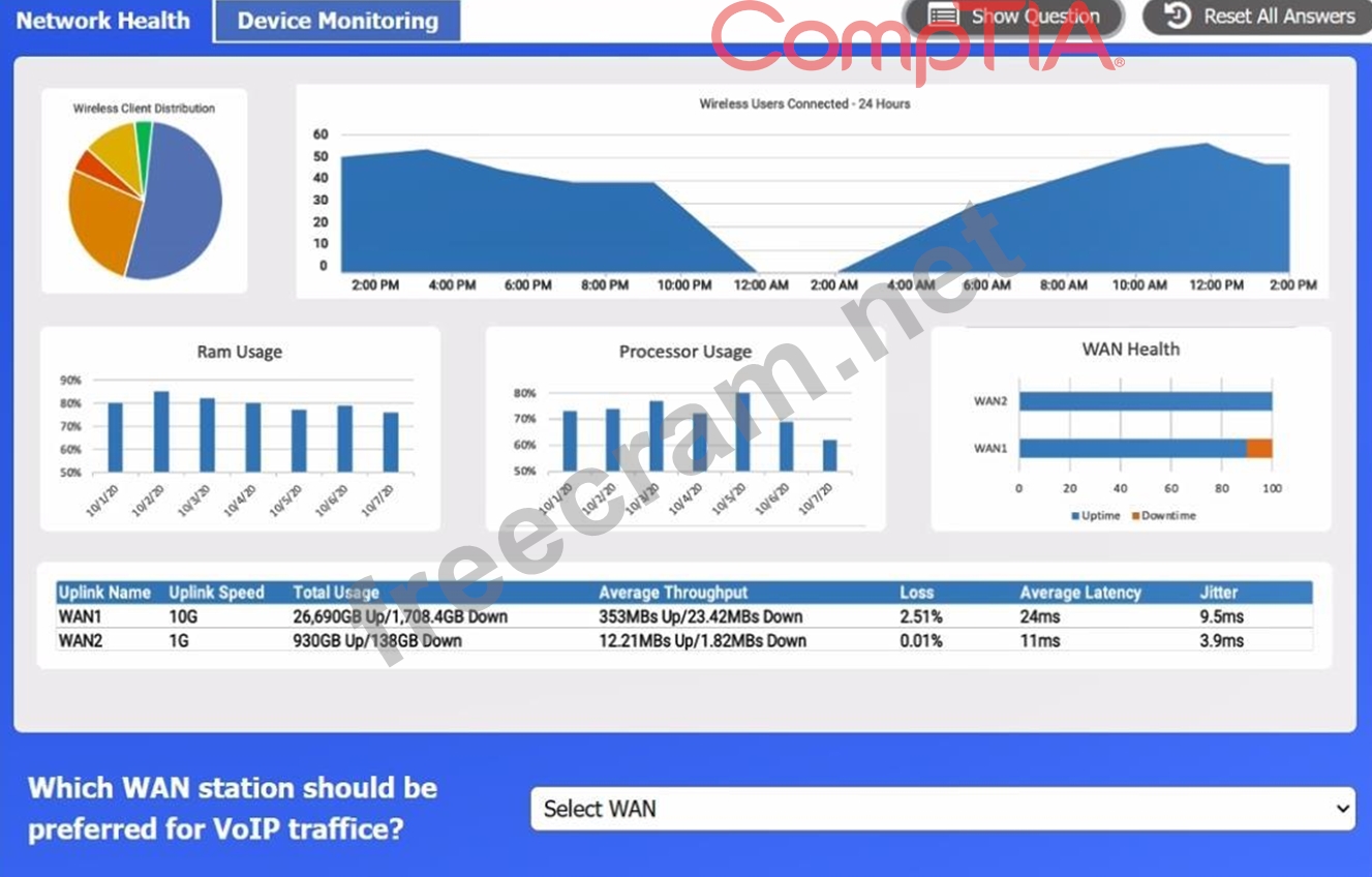 WAN 2 appears to have a lower average latency and loss percentage, which would make it the preferred WAN station for VoIP traffic. VoIP traffic requires low latency and packet loss to ensure good voice quality and reliability. WAN 1 seems to have higher RAM and processor usage, which could also affect the performance of VoIP traffic.