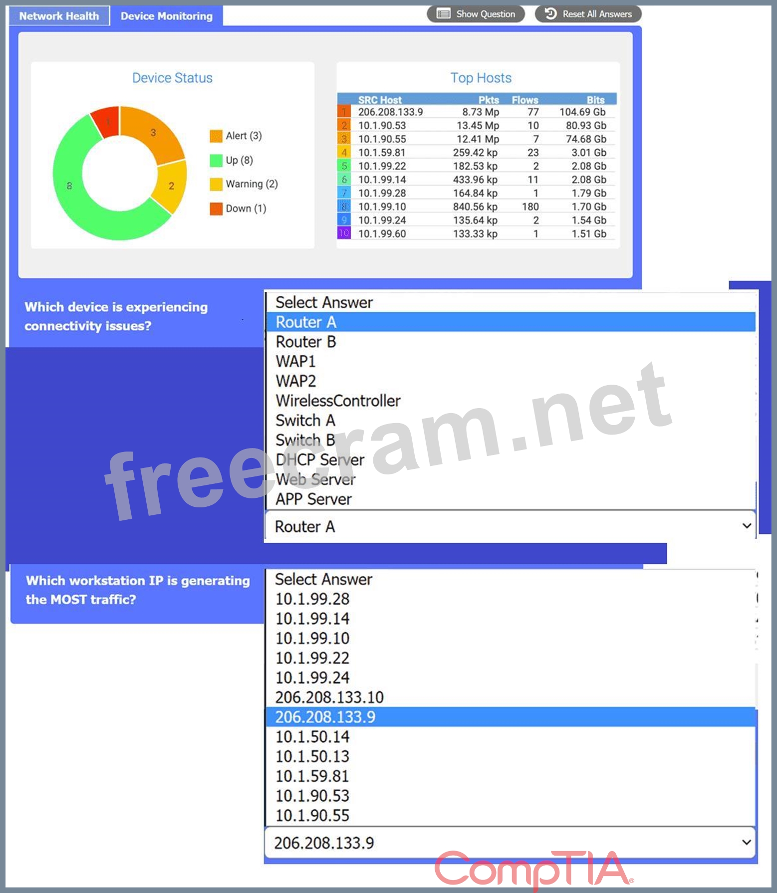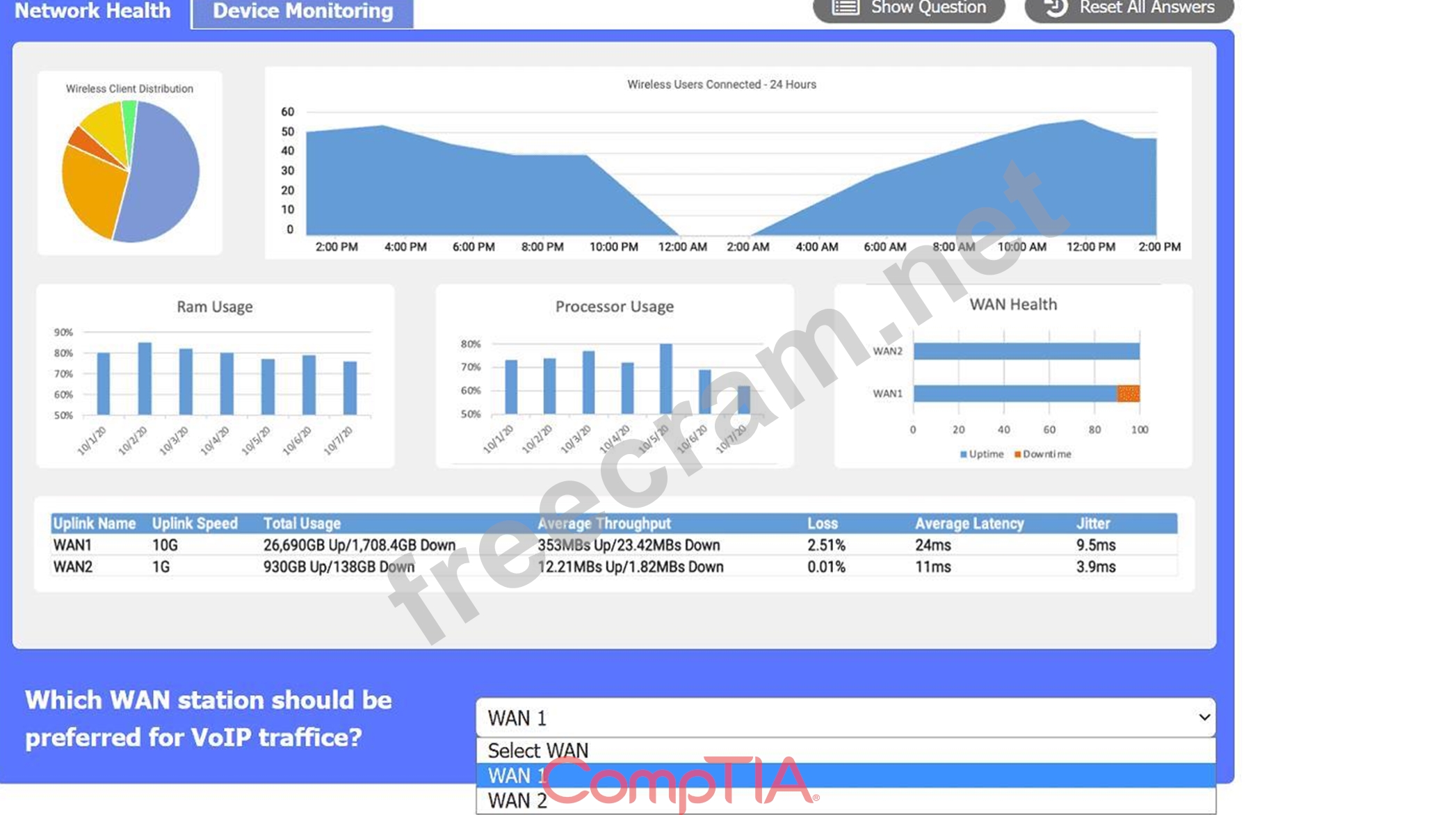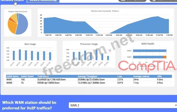 WAN 2 appears to have a lower average latency and loss percentage, which would make it the preferred WAN station for VoIP traffic. VoIP traffic requires low latency and packet loss to ensure good voice quality and reliability. WAN 1 seems to have higher RAM and processor usage, which could also affect the performance of VoIP traffic.