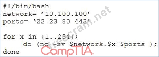 Question 38: A penetration tester writes the following script: (Exhibit) ...
