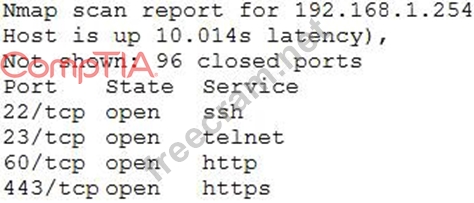 Question 151: An Nmap scan of a network switch reveals the following: (Exh...