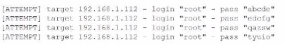 The output shows multiple login attempts with different passwords for the same username "root" on the IP address 192.168.1.112. This is indicative of a brute force attack, where an attacker systematically tries various password combinations to gain unauthorized access. Reference: The Official CompTIA PenTest+ Study Guide (Exam PT0-002), Chapter 4: Conducting Passive Reconnaissance; The Official CompTIA PenTest+ Student Guide (Exam PT0-002), Lesson 4: Conducting Active Reconnaissance.