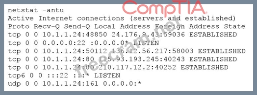 The image shows the output of the netstat -antu command, which displays active internet connections for the TCP and UDP protocols. The output shows that there are four established TCP connections and two listening UDP connections on the host. The established TCP connections have high numbered ports as their local addresses, such as 49152, 49153, 49154, and 49155. These ports are in the range of ephemeral ports, which are dynamically assigned by the operating system for temporary use by applications or processes. The foreign addresses of these connections are also high numbered ports, such as 4433, 4434, 4435, and 4436. These ports are not well-known or registered ports for any common service or protocol. The combination of high numbered ports for both local and foreign addresses suggests that these connections are suspicious and may indicate a backdoor or a covert channel on the host. Therefore, the penetration tester should investigate these connections next to determine their nature and purpose. The other options are not appropriate actions for the penetration tester at this stage.