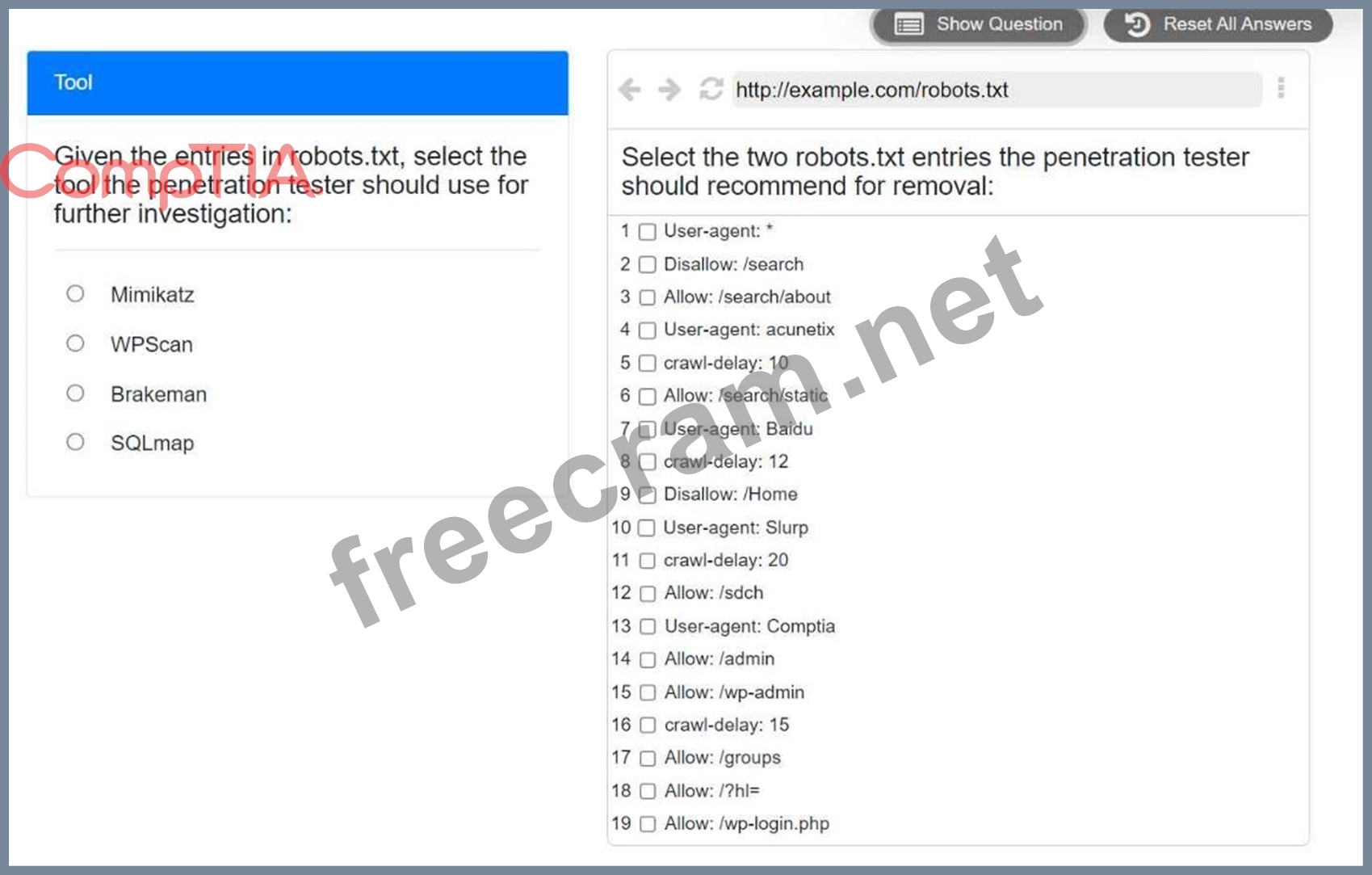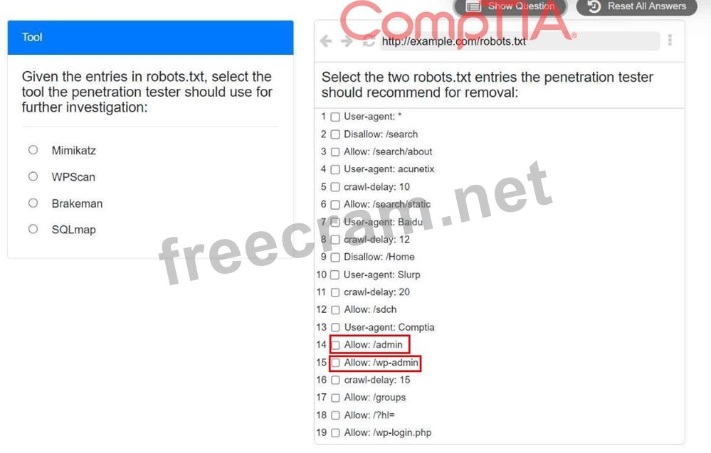 Select the two entries in the robots.txt file that the penetration tester should recommend for removal.