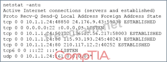 The image shows the output of the netstat -antu command, which displays active internet connections for the TCP and UDP protocols. The output shows that there are four established TCP connections and two listening UDP connections on the host. The established TCP connections have high numbered ports as their local addresses, such as 49152, 49153, 49154, and 49155. These ports are in the range of ephemeral ports, which are dynamically assigned by the operating system for temporary use by applications or processes. The foreign addresses of these connections are also high numbered ports, such as 4433, 4434, 4435, and 4436. These ports are not well-known or registered ports for any common service or protocol. The combination of high numbered ports for both local and foreign addresses suggests that these connections are suspicious and may indicate a backdoor or a covert channel on the host. Therefore, the penetration tester should investigate these connections next to determine their nature and purpose. The other options are not appropriate actions for the penetration tester at this stage.