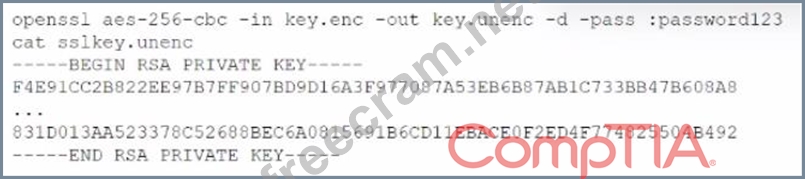 A penetration tester discovers a file, key.enc. on a shared drive and then executes the following command, which yields the following output: