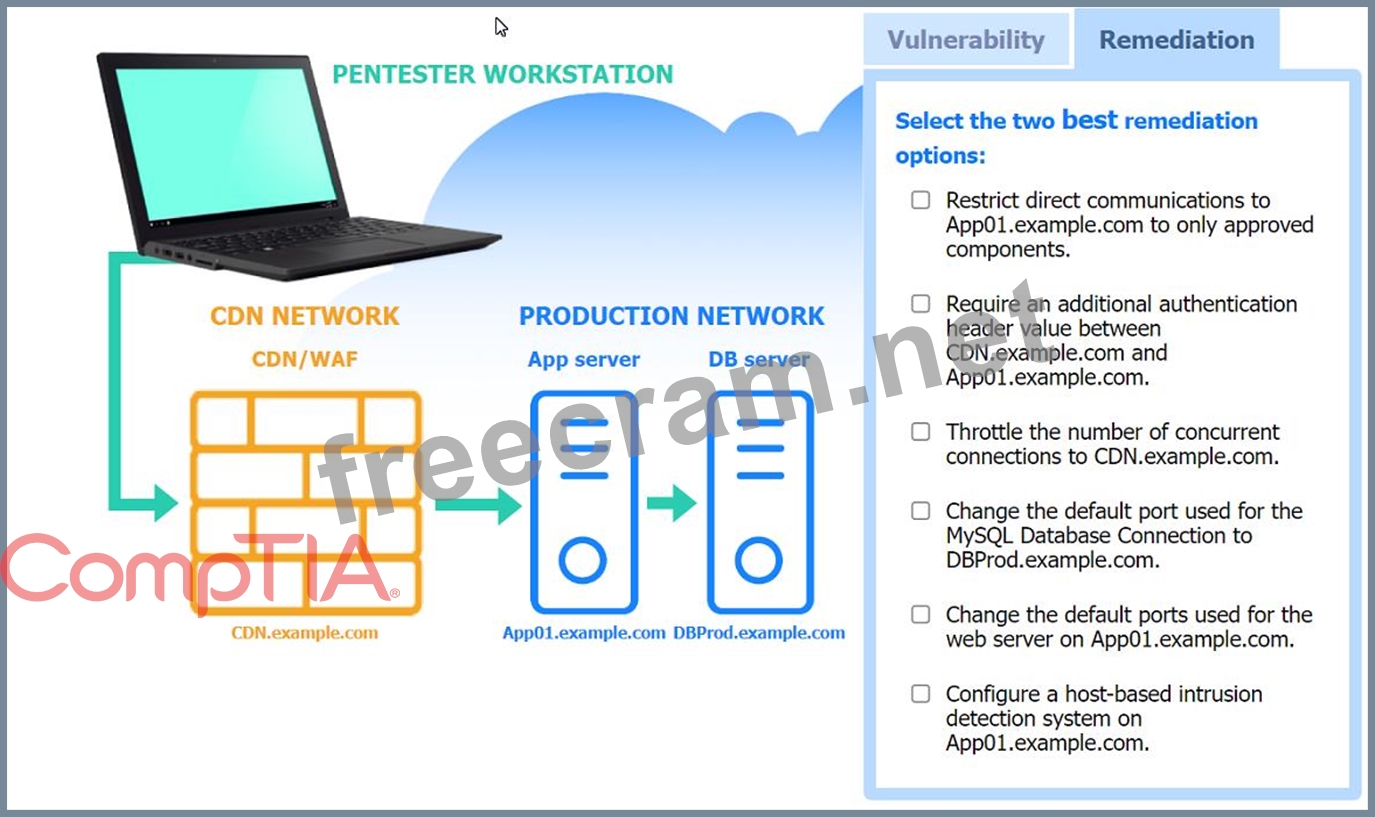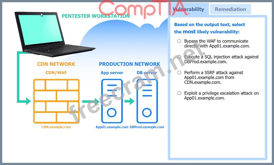 The scenario suggests that the CDN network (with a WAF) can be used to perform a Server-Side Request Forgery (SSRF) attack. Since the penetration tester has the pentester workstation interacting through the CDN/WAF and the production network is behind it, the most plausible attack vector is to exploit SSRF to interact with the internal services like App01.example.com.