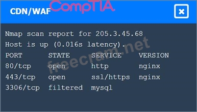 CDN/WAF shows open ports for HTTP and HTTPS but filtered for MySQL, indicating it acts as a filtering layer.