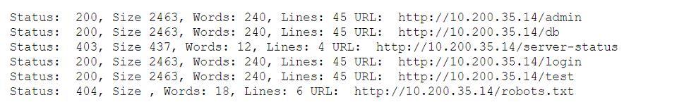 The output of the fuzzing tool shows that the admin, test, and db directories have the same size, words, and lines as the login page, which indicates that they are redirecting to the login page. This means that the tester cannot access these directories without valid credentials. The server-status page returns a 403 Forbidden status code, which means that the tester does not have permission to access it. The robots.txt file returns a 404 Not Found status code, which means that the file does not exist on the server. References: *The Official CompTIA PenTest+ Study Guide (Exam PT0-002), Chapter 2: Conducting Passive Reconnaissance, page 77-78. *101 Labs - CompTIA PenTest+: Hands-on Labs for the PT0-002 Exam, Lab 2.3: Fuzzing Web Applications, page 69-70.