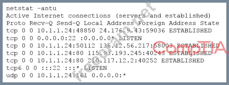 The image shows the output of the netstat -antu command, which displays active internet connections for the TCP and UDP protocols. The output shows that there are four established TCP connections and two listening UDP connections on the host. The established TCP connections have high numbered ports as their local addresses, such as 49152, 49153, 49154, and 49155. These ports are in the range of ephemeral ports, which are dynamically assigned by the operating system for temporary use by applications or processes. The foreign addresses of these connections are also high numbered ports, such as 4433, 4434, 4435, and 4436. These ports are not well-known or registered ports for any common service or protocol. The combination of high numbered ports for both local and foreign addresses suggests that these connections are suspicious and may indicate a backdoor or a covert channel on the host. Therefore, the penetration tester should investigate these connections next to determine their nature and purpose. The other options are not appropriate actions for the penetration tester at this stage.