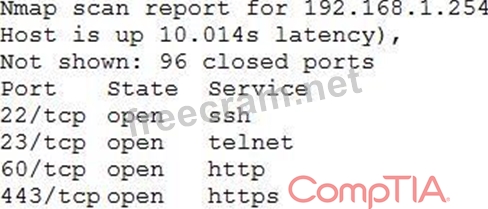 Question 172: An Nmap scan of a network switch reveals the following: (Exh...