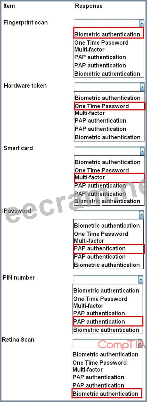 For each of the given items, select the appropriate authentication category from the drop down choices.